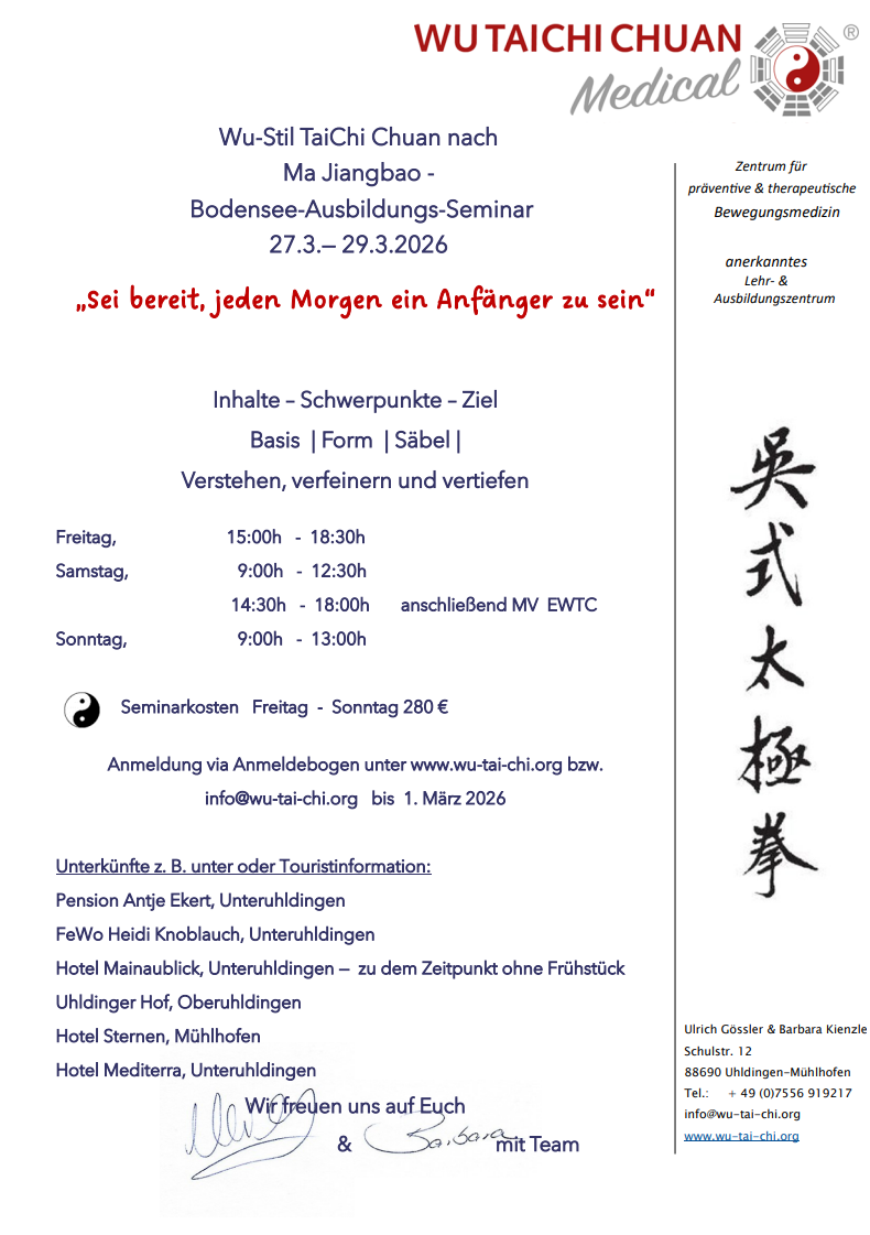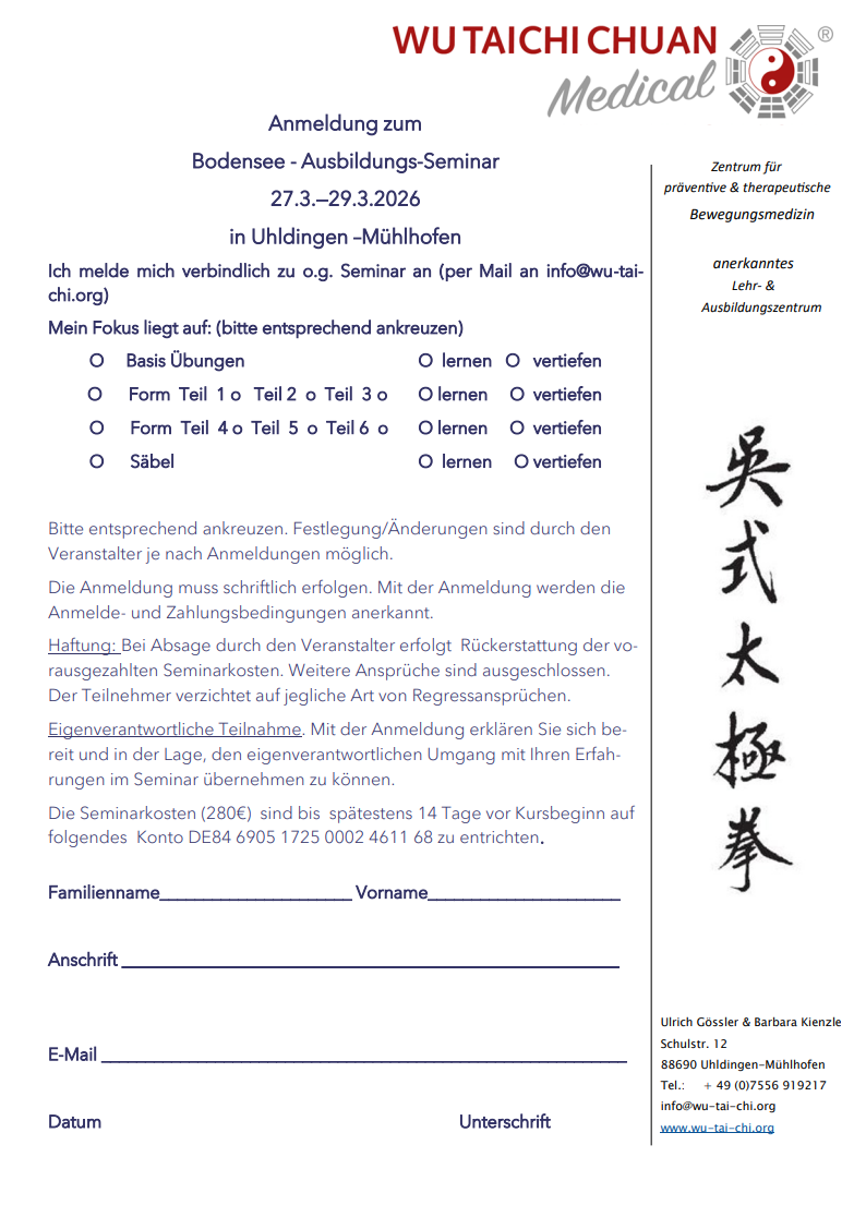 Anmeldung via Anmeldebogen unter www.wu-tai-chi.org bzw. info@wu-tai-chi.org bis 1. März 2026